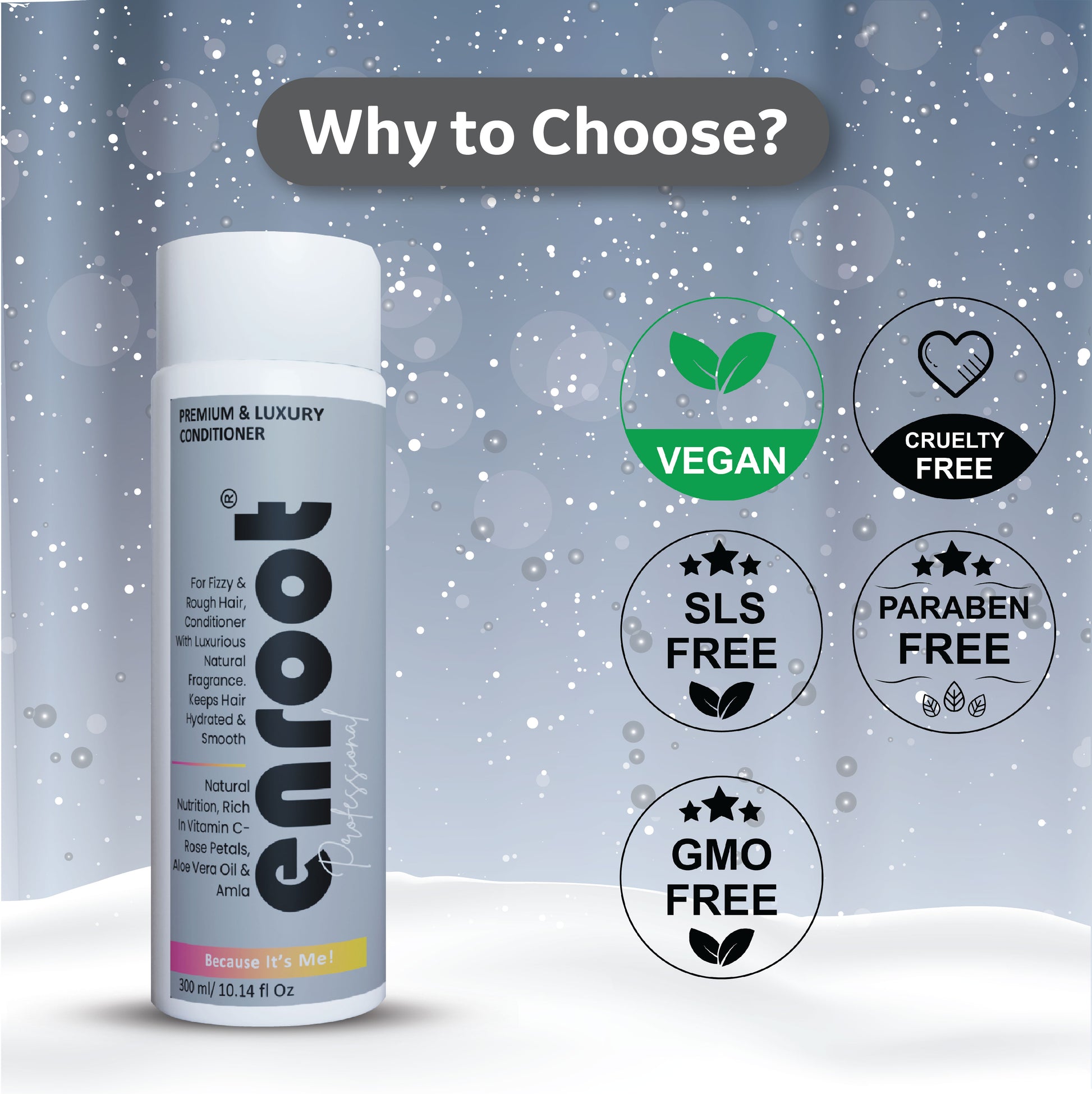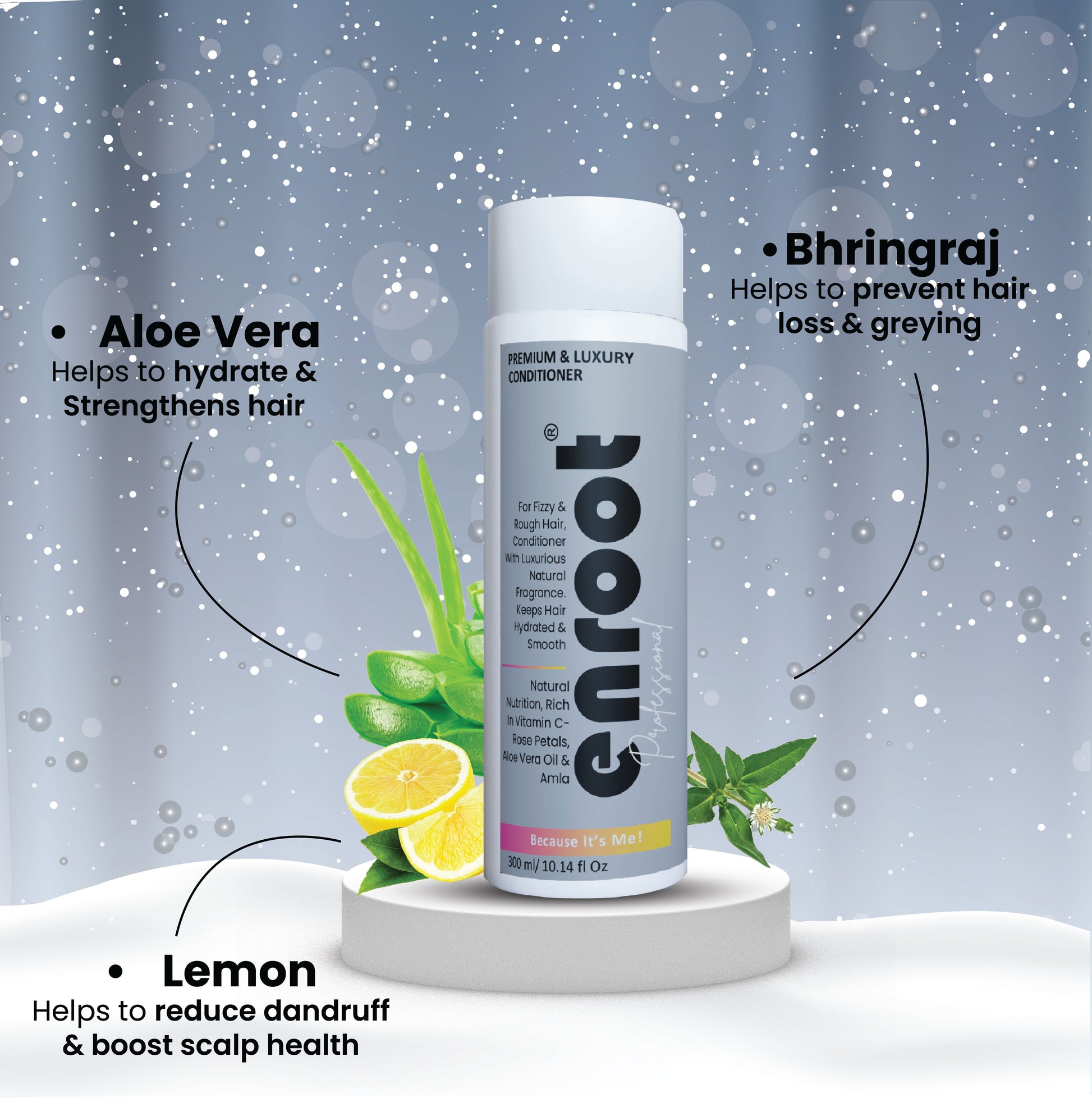 The Enroot Premium and Luxury Conditioner [300ml] is your daily companion for maintaining healthy, vibrant hair. Formulated with rich natural extracts of rose petals, aloe vera oil, and amla, this conditioner provides deep nourishment, smoothness, and shine, making it perfect for regular use at home.