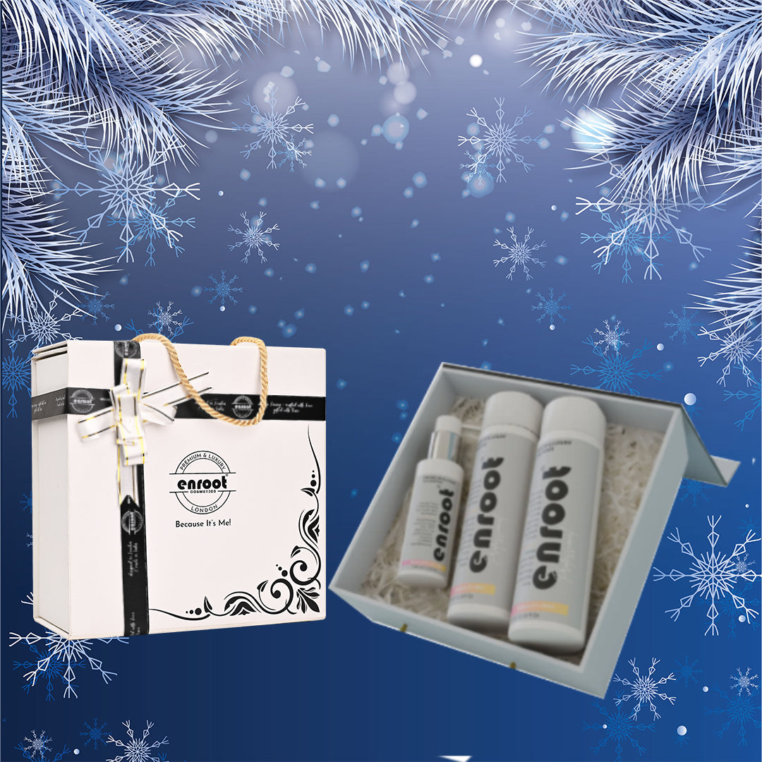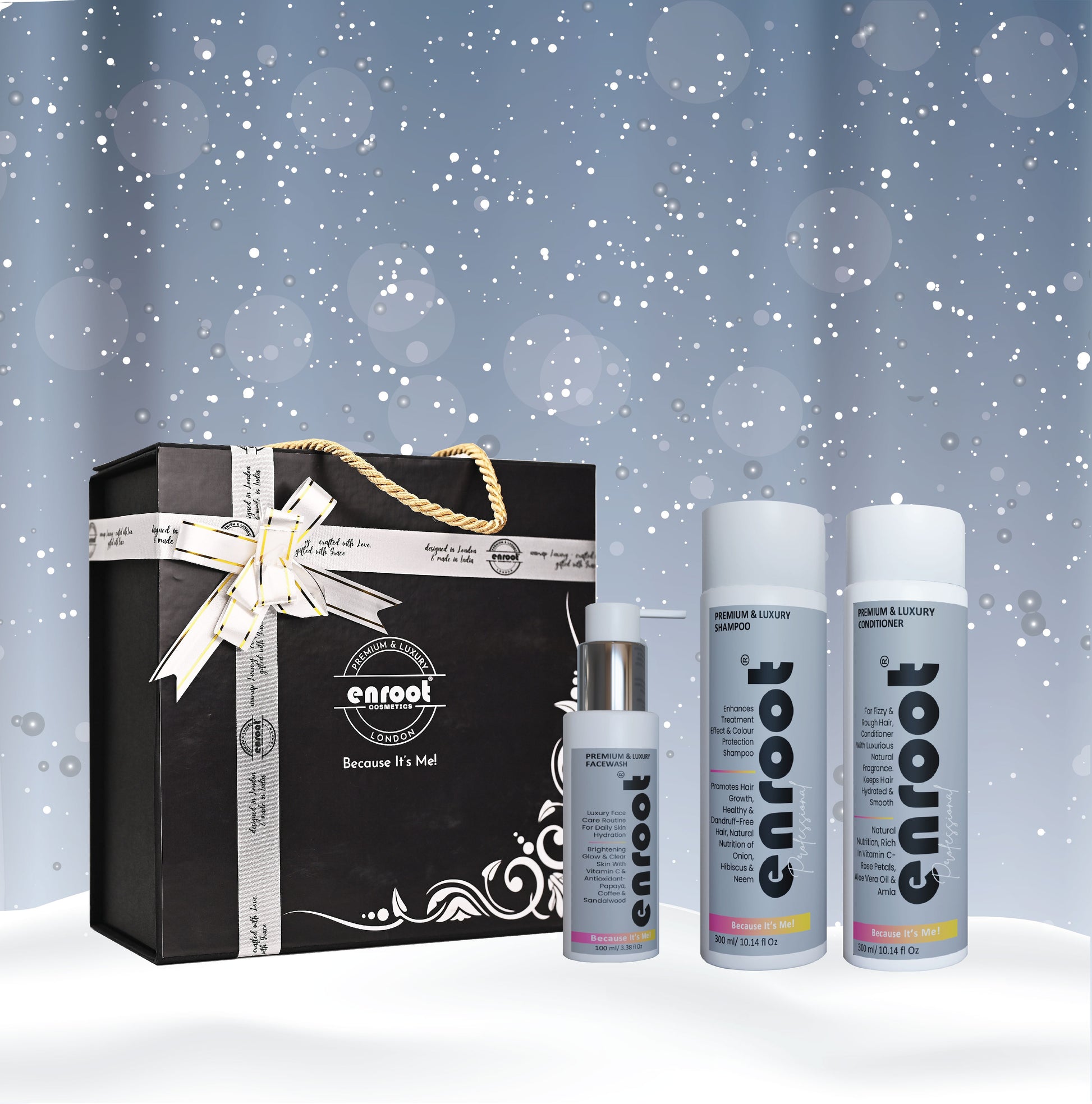 Delight in the ultimate self-care experience with the Enroot Premium & Luxury Glow & Shine Trio. This sophisticated gift box contains a 700ml set of facewash, shampoo, and conditioner, offering a complete routine for glowing skin and lustrous hair. Perfect for those who deserve the very best in beauty and care.